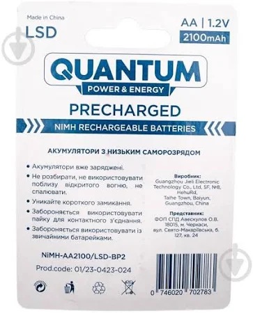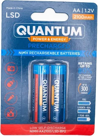 Акумулятори нікель-металгідридні Quantum з низьким саморозрядом (LSD) 2100 мАгод готові до використання. Після повної зарядки акумулятора протягом одного року залишається приблизно 85% заряду, що свідчить про низький саморозряд LSD акумуляторів, це їх основна перевага перед звичайними Ni-MH. Висока ємність та низький внутрішній опір розширюють сфери використання акумуляторів: мікрофон, цифрова камера, ігровий контролер, бездротова миша та клавіатура, електрична бритва, дитячі іграшки, електронний словник, пульти дистанційного керування телевізором та кондиціонером тощо. Акумулятори без "ефекту пам'яті" та мають тривалий термін роботи й зберігають свої властивості в екстремальних умовах із кількістю циклів перезаряджання близько 1200.