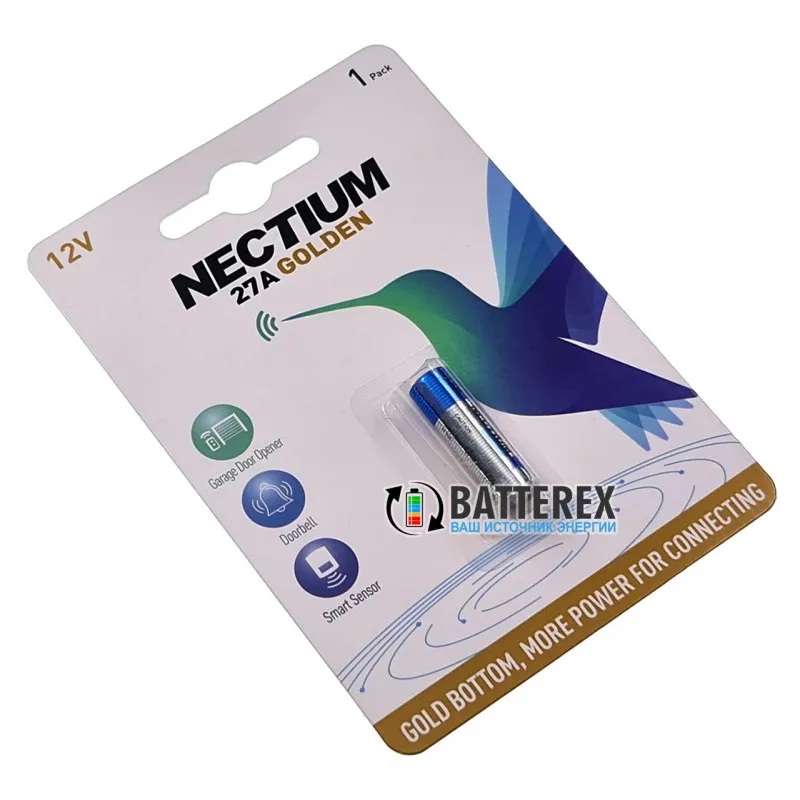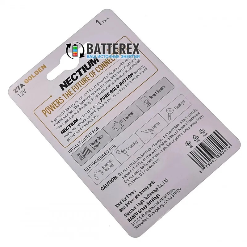 A27 Nectium Golden 12V - лужна батарейка на 12 вольт з позолоченим контактом "мінус", яка забезпечує кращу струмовіддачу, швидшу реакцію пристроїв та захист від корозії контактів. Батарейка А27 також має маркування 27А, MN27, L828, CA22.