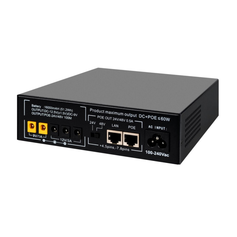 Джерело безперебійного живлення (ДБЖ) GV-701-UPS-DC16-60W складається з імпульсного блока живлення, який перетворює вхідну напругу 100-240 V (частота мережі – 50/60 Гц) до параметра DC DC 9V /12 V і акумуляторної батареї 12 V ємністю 16000 mAh.