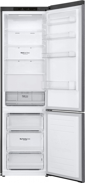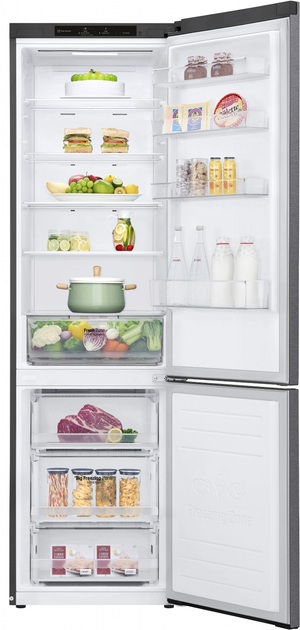 Холодильник LG GC-B509SLCL оснащений морозильною камерою з нижнім розташуванням та технологією No Frost, що забезпечує рівномірний розподіл холоду та запобігає утворенню інею. Загальний об'єм пристрою становить 419 літрів, з яких 277 літрів посідає холодильну камеру, а 107 літрів — на морозильну. Це дозволяє зберігати велику кількість продуктів, зберігаючи їх свіжість та смакові якості.