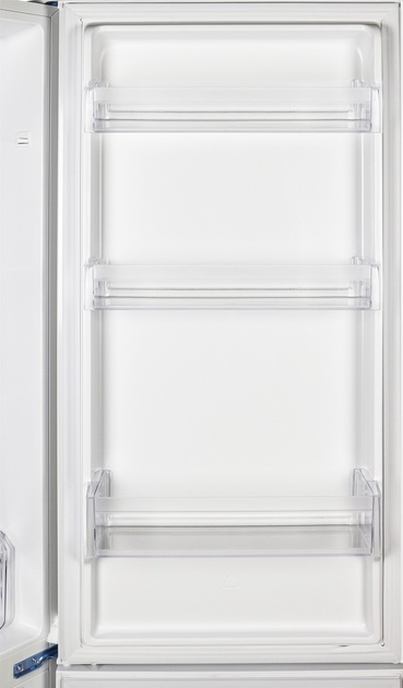 У холодильному відділенні передбачено 4 скляні полиці, 3 дверні кошики та 1 контейнер для овочів, що дозволяє зручно організувати зберігання продуктів. Для пляшок передбачена полиця в дверях, а морозильне відділення розділене на 3 секції, що зручно для заморожування різних продуктів.