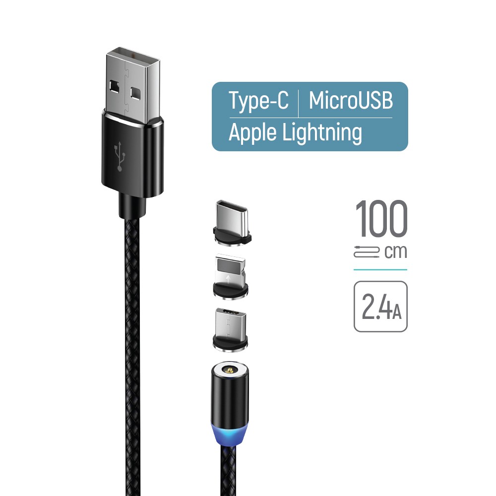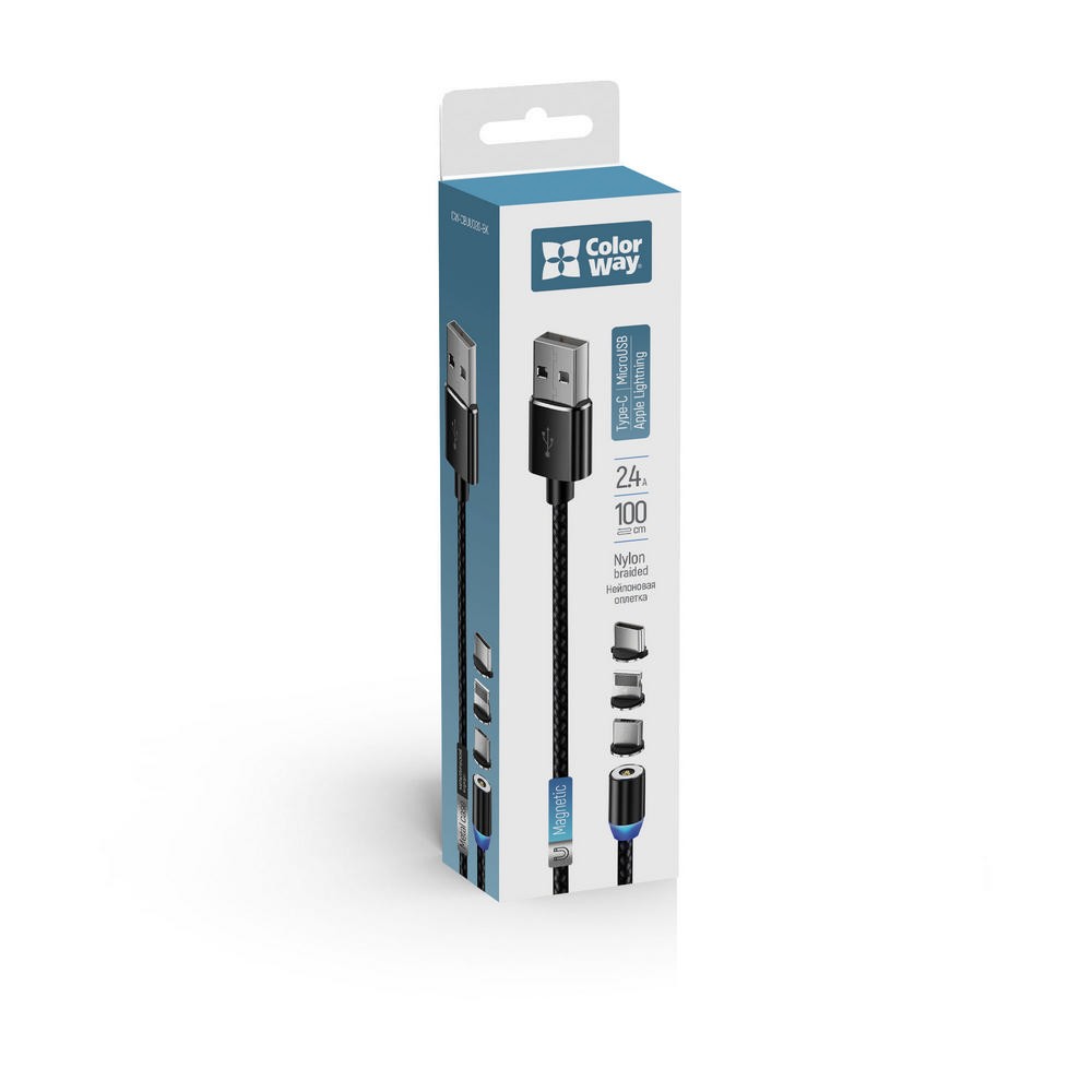 Магнітний кабель 3в1 ColorWay для зарядки - Високоякісний магнітний кабель з функцією ротації на 360 градусів для зарядки телефону, планшета або інших електронний пристроїв, які мають роз'єми Lightning, microUSB або Type-C. Кабель швидко заряджає необхідний пристрій, він має надійний і потужний магніт, а також Led індикатор. Зовні аксесуар обтягнутий шаром нейлонового покриття, завдяки чому кабель важко зігнути або пошкодити. Довжина кабелю становить 1 метр, чого повинно цілком вистачити для комфортного використання вдома або в офісі.