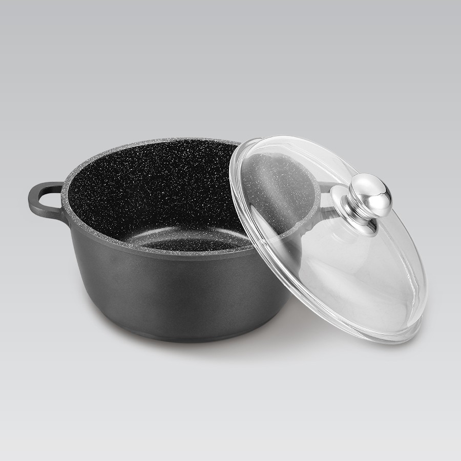 Каструля Maestro MR4628C діаметром 28 сантиметрів має корисний об'єм 5,8 літра, виготовлена з міцного литого алюмінію, з багатошаровим дном відповідним для всіх типів джерел тепла. Усередині каструлі Maestro MR 4628C нанесено керамічне антипригарне покриття дозволяє варити, тушкувати і навіть смажити продукти в даній посуді