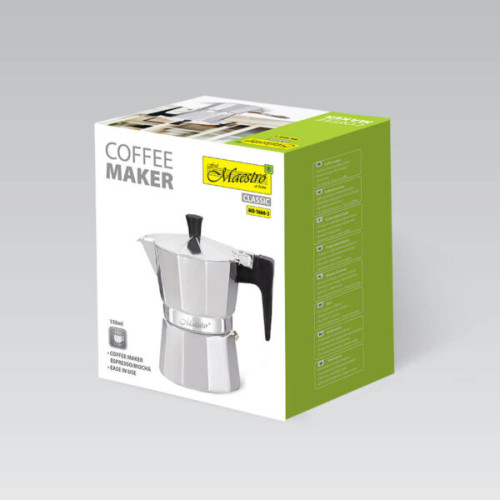 Гейзерна кавоварка Maestro MR1666-9 призначена для приготування кави як еспресо так і мокко. Кавоварка має обсяг 900 мл відповідний шести чашкам кави еспресо