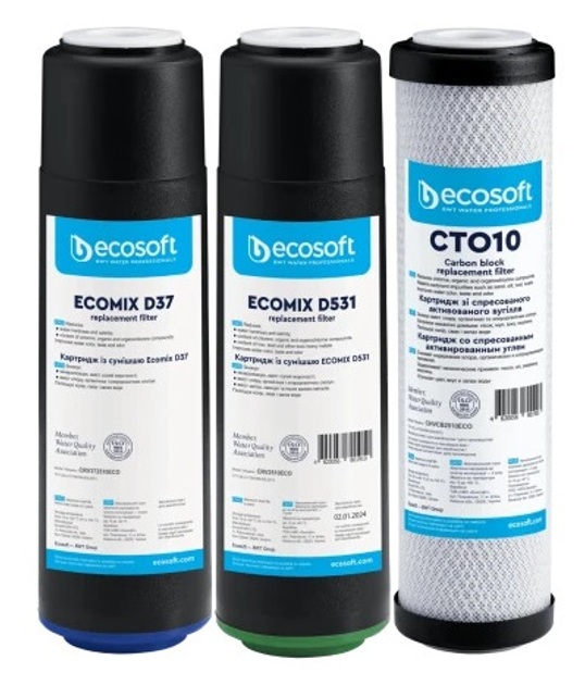 До складу комплекту входить 3 змінні картриджі, 2 з яких заповнені фільтрувальною сумішшю серії ECOMIX — унікальної розробки української компанії Ecosoft. Ще одна головна відмінність від звичайного картриджа для потрійних фільтрів — дворазове збільшення ресурсу (3 000 літрів чистої питної води).