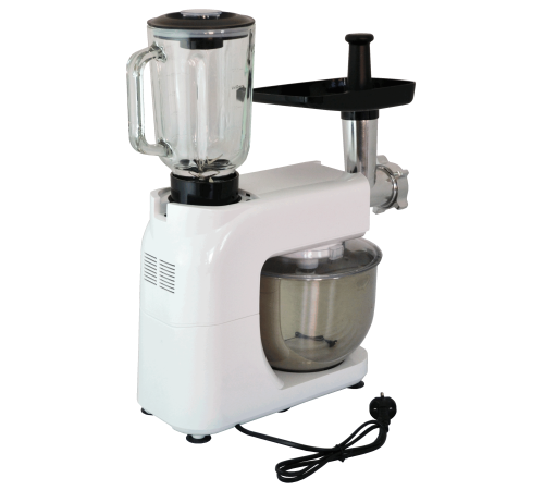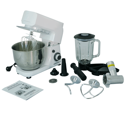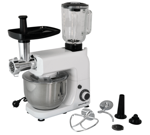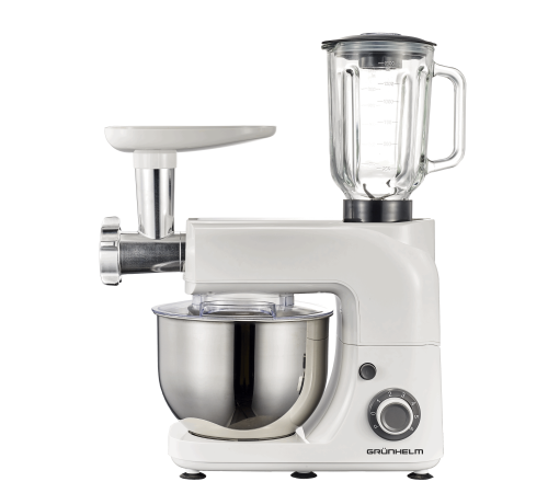 Кухонний комбайн GKM0020 Grunhelm стане незамінним помічником на Вашій кухні. Модель обладнана планетарним міксером, м'ясорубкою і скляним блендером. Машина оснащена функціями замісу тіста, подрібнення, збивання, перемішування, подрібнення, приготування напоїв і фаршу. Знімна чаша об'ємом 5 л виготовлена з нержавіючої сталі. Для зручного використання передбачено 6 швидкостей, які регулюються за допомогою ручки.