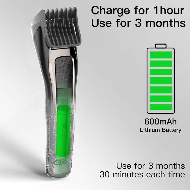 При роботі використовується потужний тихий мотор зі швидкістю обертання 7300 об/хв (підійде для густого волосся). При цьому навіть у турборежимі машина практично не нагрівається. Вбудований акумулятор 600 mAh. Тепер Ви можете постригтися самостійно, не витрачаючи багато часу, сил і грошей.