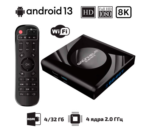 Смарт ТБ Приставка GX-88 PRO 13 Grunhelm - високопродуктивний пристрій з 4-ядерним процесором Rockship Rk3528. За допомогою цієї моделі ви зможете переглядати потокові відео у високій роздільній здатності.