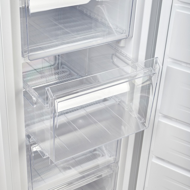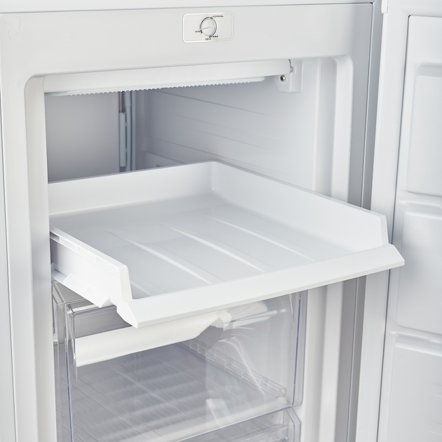 Усередині морозилка оснащена 4 пластиковими ящиками, кожний з яких можна призначити під конкретні види продуктів: м'ясо, рибу чи овочі. Інтерфейс користувача максимально простий – пластикова ручка, заплутатися в керуванні камерою просто неможливо. Статична система охолодження є найнадійнішою і водночас найпростішою. Волога легко накопичується на внутрішній стіні морозильної камери й стікає у випарник. Тому потрібно періодично розморожувати камеру. Заморозити можна у температурному діапазоні від -14 до -22 градусів.