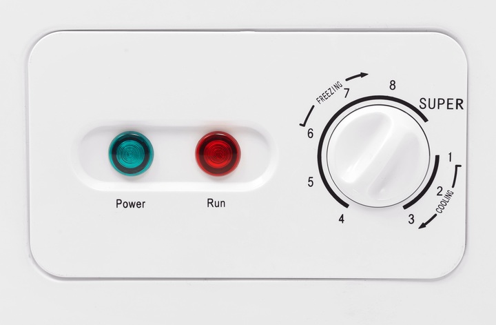 Вибирайте температуру заморожування простим поворотом регульованого термостата. Індикатори вмикаються, коли прилад підключається до живлення і коли починається охолодження.