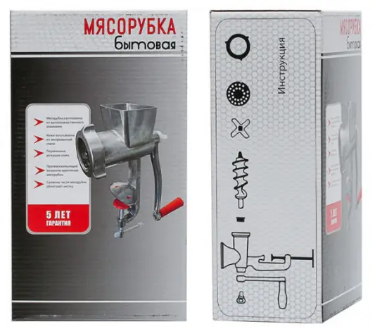 Це незамінний прилад на кухні. Механічна м'ясорубка виготовлена з литого алюмінієвого корпусу. Надійна і ручна м'ясорубка для подрібнення м'яса, риби, горіхів та овочів. Корпус низу оснащений ніжками з гумовими накладками і гвинтовим затиском. Гвинтовий затиск закручується, щільно притискає ніжки до стільниці, що не дає приладу зміщуватися під час роботи. Випускається дана модель у місті Харків.