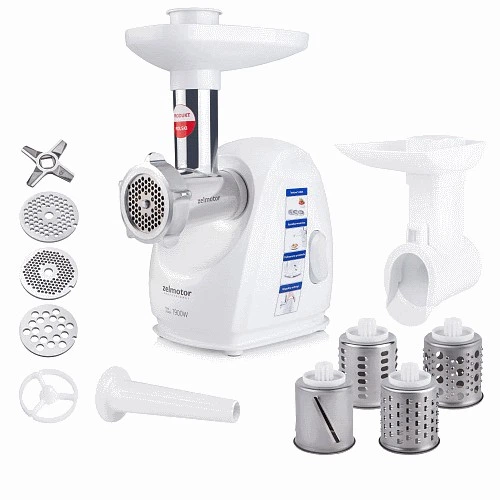 М'ясорубка Zelmotor 489.81 - багатофункціональний пристрій, оснащений виготовленими із загартованої легованої сталі 4-лезовим ножем і трьома решітками з отворами різного діаметру: 2,7, 4 і 8 мм.
