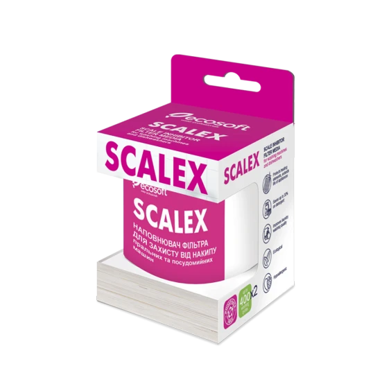 Інноваційний наповнювач Ecosoft Scalex розроблений для фільтрів, що встановлюються на пральні та посудомийні машини. Його головне завдання — запобігання утворенню накипу на нагрівальних елементах, що подовжує термін служби техніки та підвищує її ефективність.