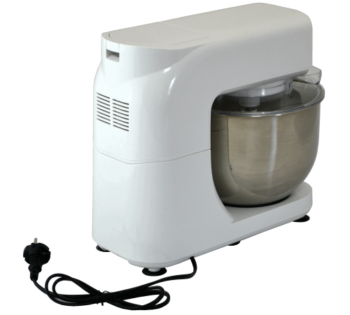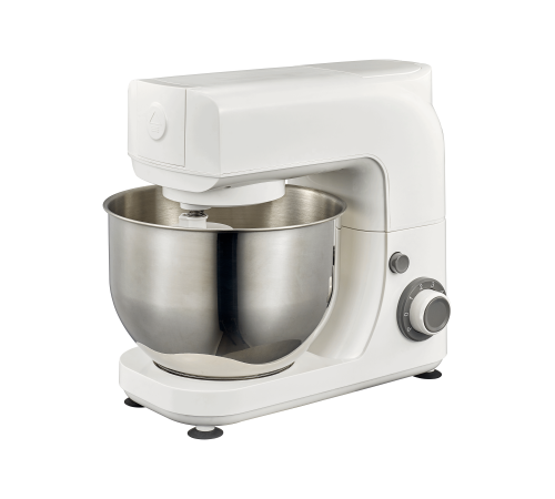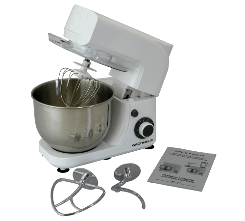 У комплект входять 5-літрова чаша з нержавіючої сталі, віночок, гак для тіста і насадка для збивання. Потужний мотор потужністю 1800 Вт дозволяє легко готувати суміші, креми та тісто для випічки.