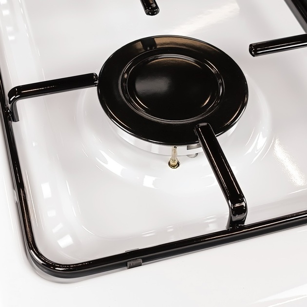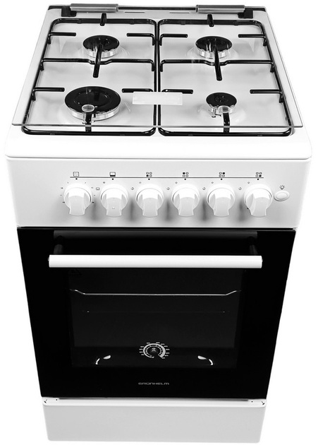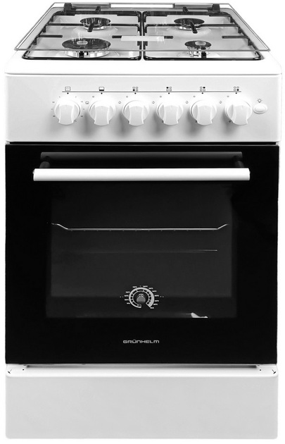 Окрема кухонна плита Grunhelm G4FG5612W з газовими конфорками та газконтролем. Газова духовка на 58 літрів з підсвічуванням (кнопкою) та емаллю легкого очищення. Плита має відділення для посуду у вигляді висувної скриньки та кришку із загартованого скла. Посилена теплоізоляція бічних стінок. Висока якість емалі та товстий метал. Газові конфорки виробництва Туреччина. Тиск газу – 20 мбар, Загальна потужність – 1000 Вт, Категорія газу – I2H2L, Витрата газу (G20) – 0.70 м куб/год, Витрата газу (G25) – 0.71 м куб/год