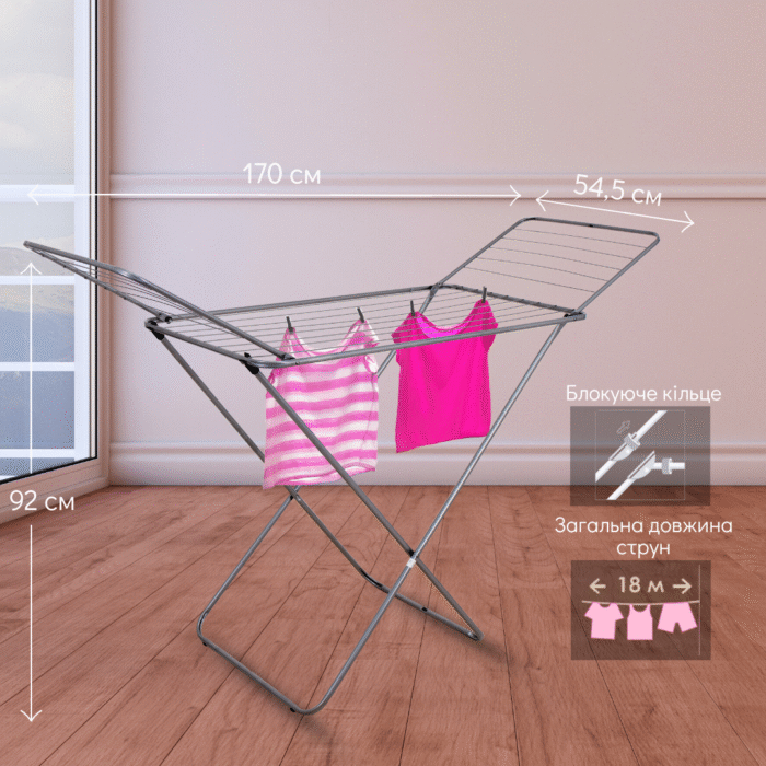 Металева сушарка для білизни STABI — приємна та проста у використанні модель, яка ідеально підходить для людей, які шукають мінімалістичний та необтяжений будь-яким варіантом сушарки. При цьому захисне епоксидне покриття робить метал більш зносостійким, а саму сушарку — довговічнішою. Розкладні крила забезпечують економічний простір та легкість у зберіганні, водночас надаючи додатково 7 м корисної тривалості. Загальна довжина всіх сторінок становить 18 м.