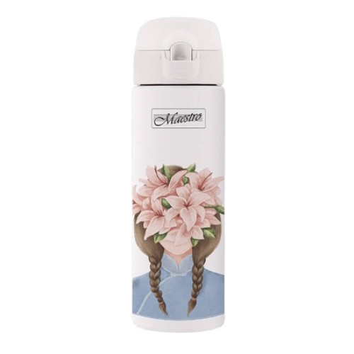 Термос з носиком для пиття Maestro MR 1634-B обсягом 400 мл виготовлений з нержавіючої сталі. На корпусі зображено дівчину з квітами замість обличчя