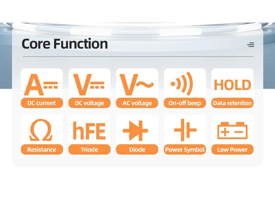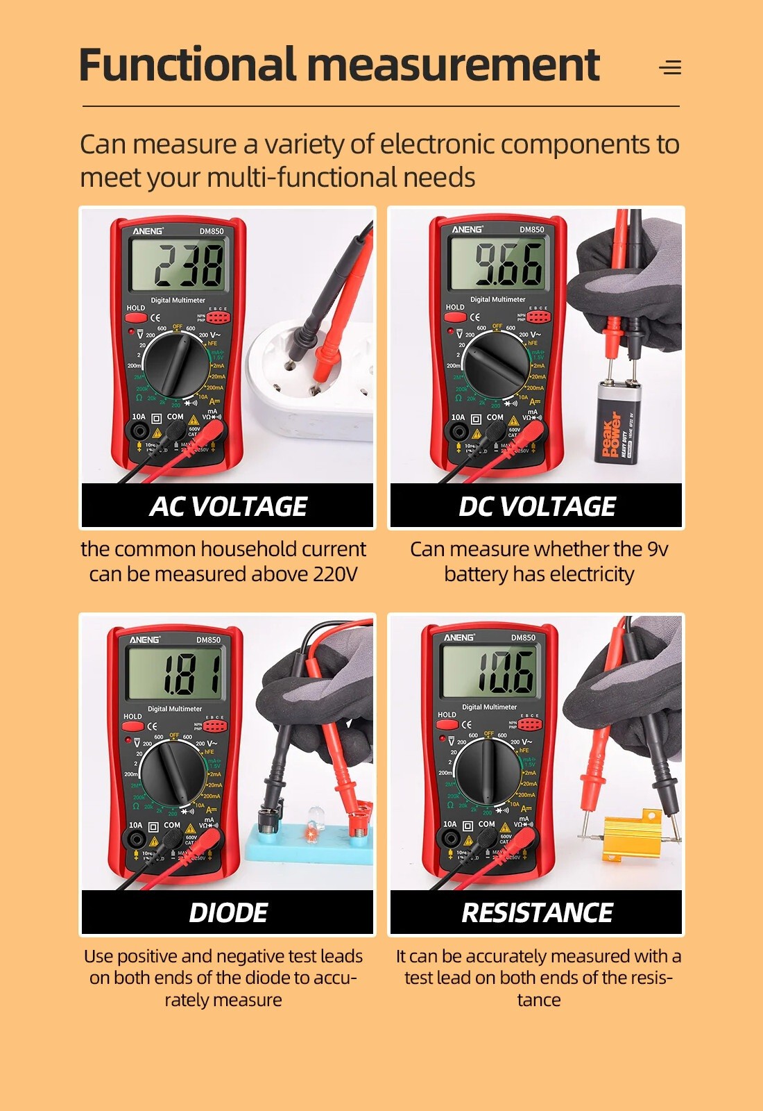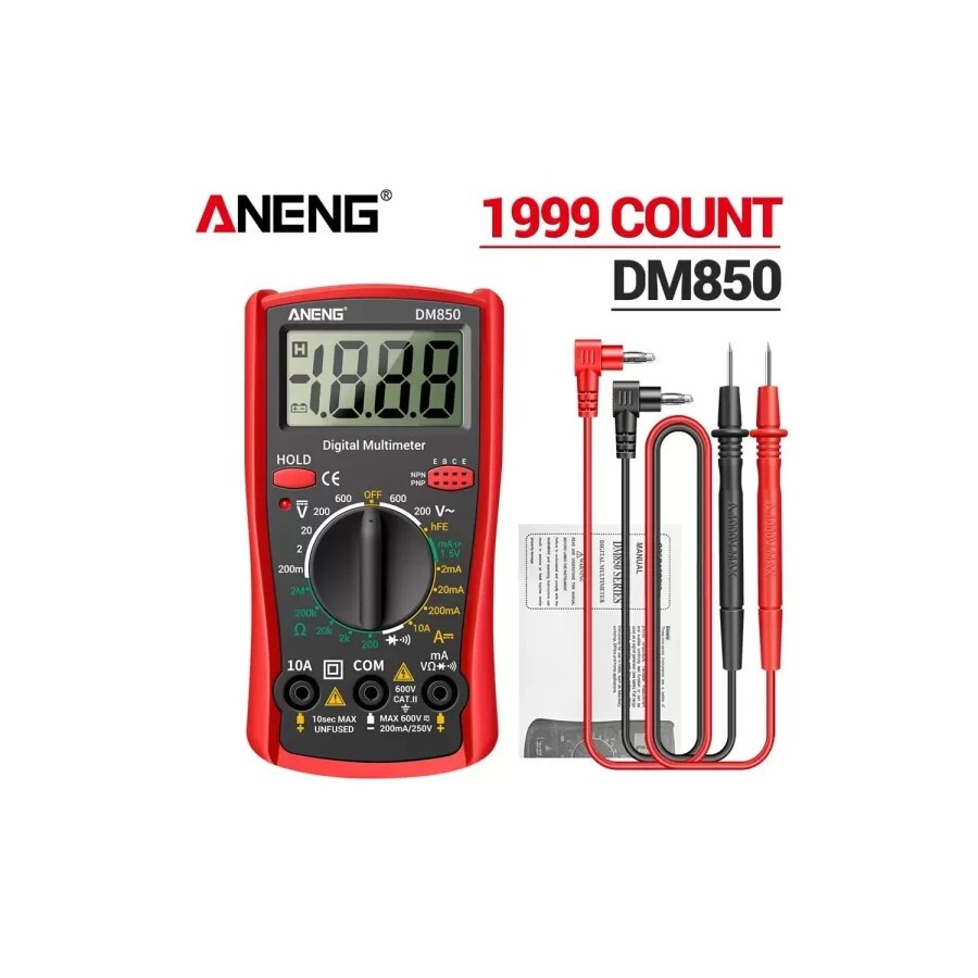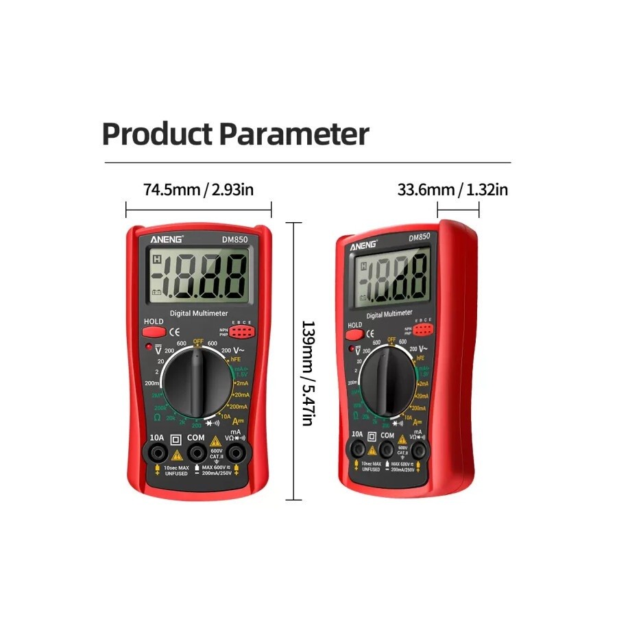 Цифровий мультиметр ANENG DM850 призначений для точних вимірювань. Його дисплей забезпечує зручність зчитування показників, а функція перевірки безперервності звуку сприяє швидкій діагностиці. Мультиметр підтримує вимірювання постійної та змінної напруги до 600V, а також постійного струму до 10А. ANENG DM850 оснащений захистом від перевантаження, який спрацьовує через 15 секунд. Компактні розміри й вага 218г роблять мультиметр зручним для транспортування та використання.