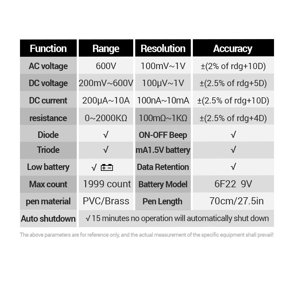 - Постійний струм: 200uA/2000uA/20mA + -(2% of rdg+2D) 200mA + -(2.5% of rdg+2D) 10A + -(2.5% of rdg+10D) AC Voltage: 200V/600V + -(2% of rdg+10D)