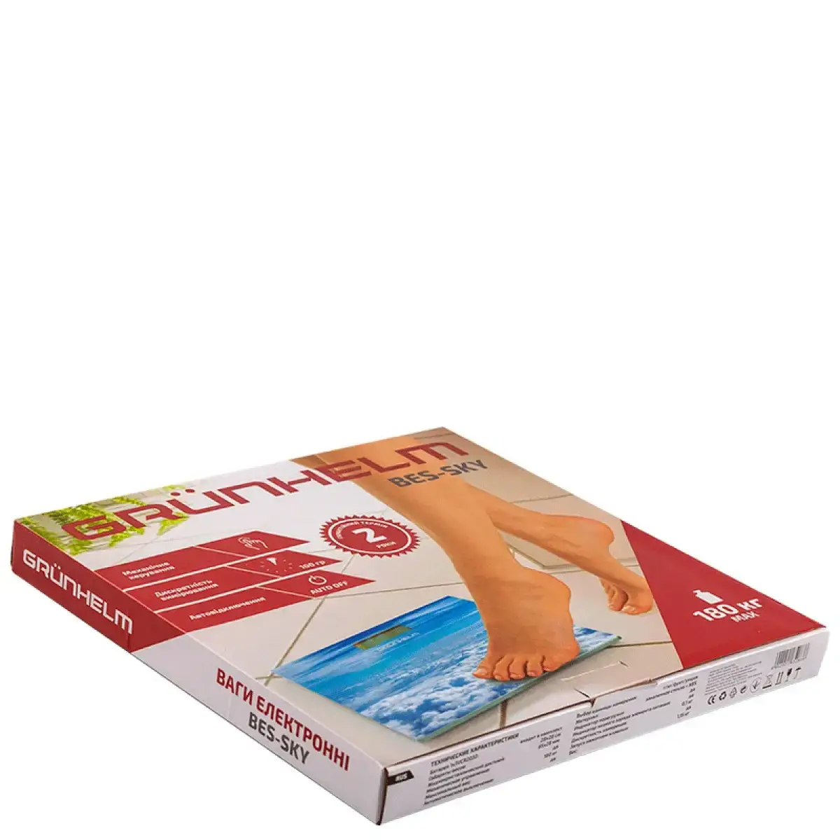 Опис Ваги для підлоги BES SKY Grunhelm Персональні ваги підлоги - пристрій для вимірювання власної ваги. Особливості даних ваг ультратонкий дизайн, корпус виготовлений із загартованого скла та міцного пластику, максимальна вага виміру – 180 кг. Запуск відбувається натисканням кнопки. Великий рідкокристалічний дисплей відображає результат у вигляді великих цифр, що легко читаються. Нейтральна кольорова гама підходить як для чоловіків, так і для жінок. Функціонал приладу включає зручне сенсорне управління, автоматичне завершення роботи та широкий вибір одиниць вимірювання (г/кг/фунт/унція). Завдяки використанню унікальної сенсорної технології вага визначається з точністю до 100 г. Слідкувати за здоров'ям – ЦЕ ПРОСТО!