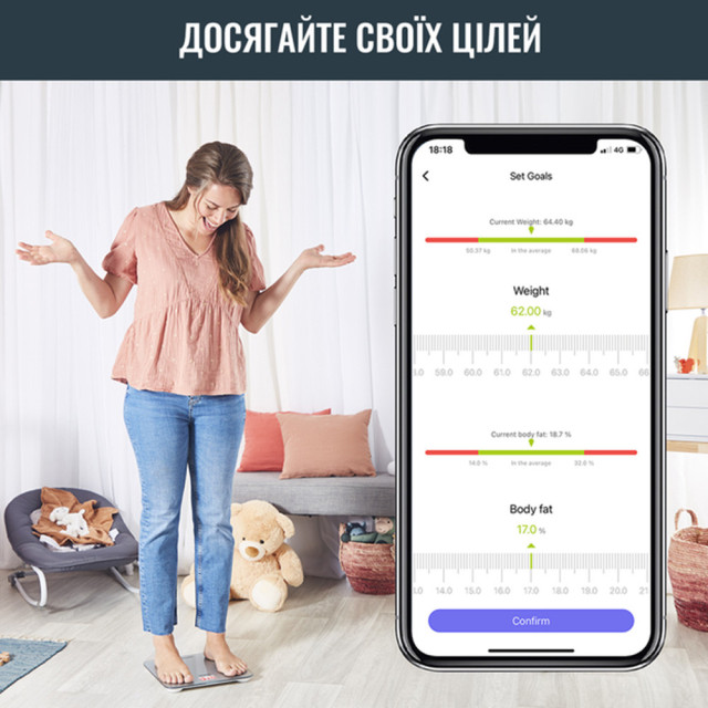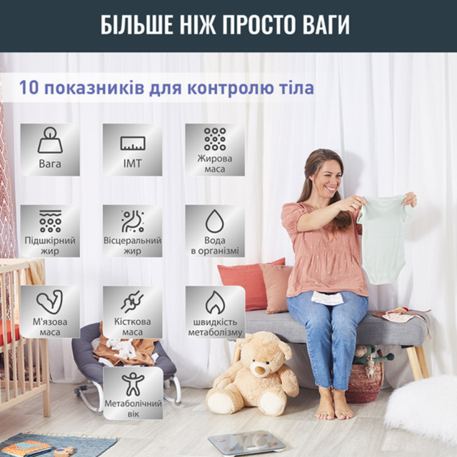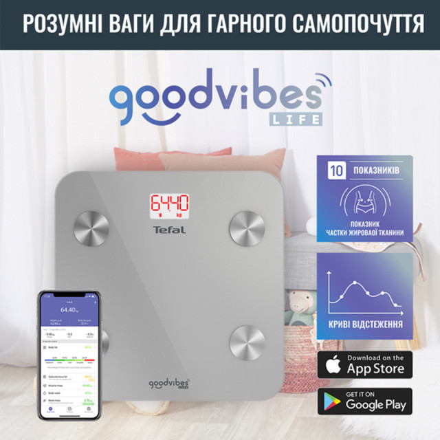 Tefal GOODVIBES LIFE вимірюють 11 параметрів: масу тіла, індекс маси, жирову, кісткову, м’язову масу, воду в організмі, внутрішній та підшкірний жир, рівень обміну речовин і навіть біологічний вік.