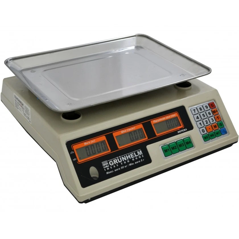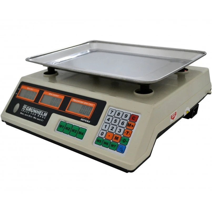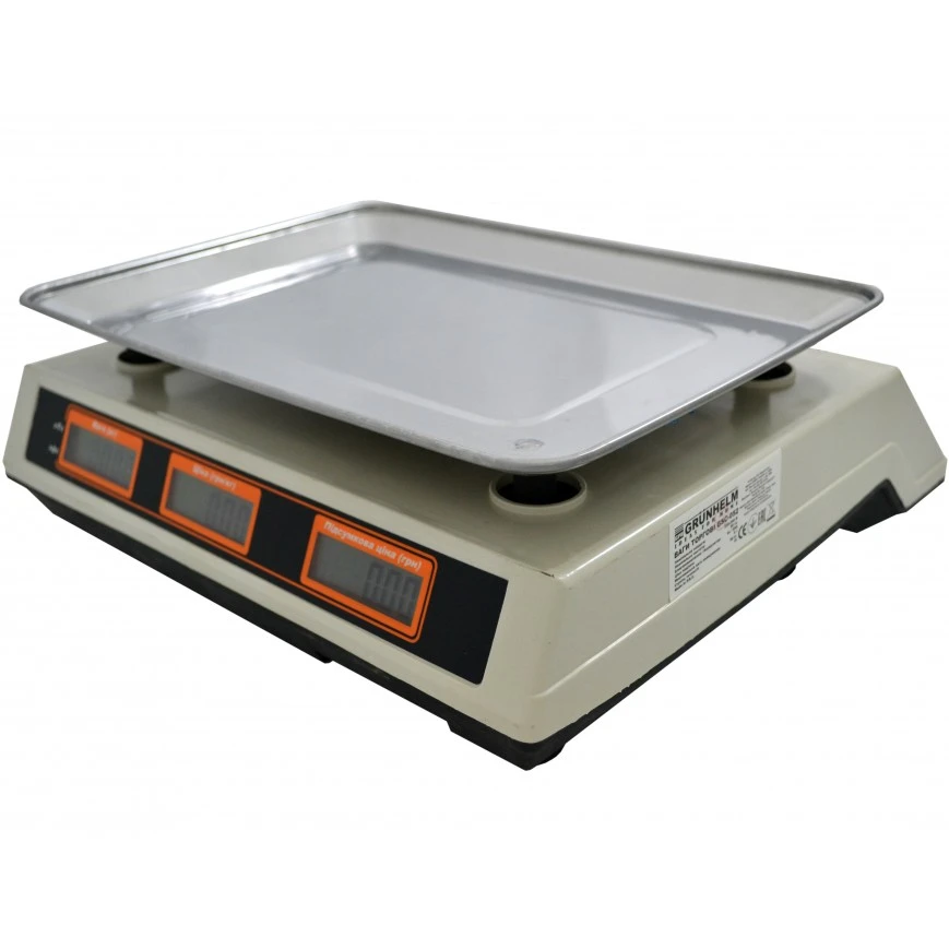 Ваги електронні, торгові GRUNHELM з калькулятором – призначені для зважування різних вантажів при торгових, облікових та технологічних операціях, а також для фасування та розрахунку вартості товару на підприємствах торгівлі та громадського харчування. Корпус ваг виготовлений із пластику, платформа зроблена з нержавіючої сталі.