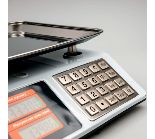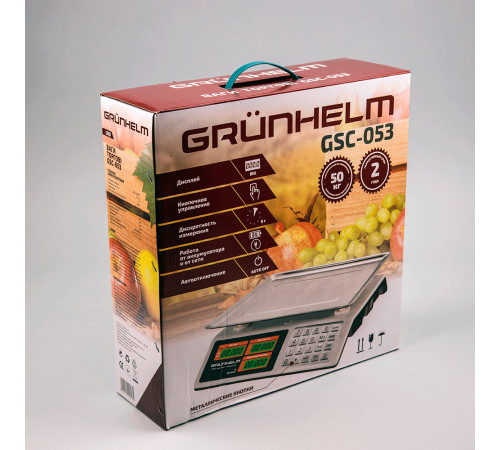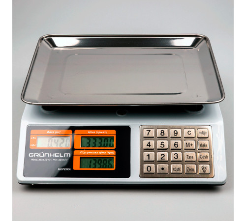 Торгові ваги GSC-053 Grunhelm - зручна та практична модель з калькулятором та межею зважування 50 кг. Відмінний варіант для роботи в магазині, кафе, складах, ринковій торгівлі. Модель працює від мережі чи акумулятора. Ніжки регулюються. Корпус ваг виготовлений із пластику, платформа з нержавіючої сталі. Терезами зручно керувати за допомогою металевих клавіш, вся інформація відображається на ЖК дисплеї. Є функції обнулення ваги, тарування, а також індикатор навантаження та низького заряду батареї.