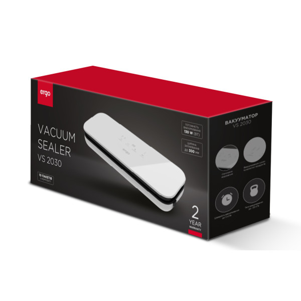 Вакуумний пакувальник ERGO VS 2030 — це побутовий пристрій для вакуумування сухих та вологих продуктів, потужністю близько 130 Вт, оснащений вбудованим ножем та призначений для домашнього використання, що дозволяє подовжити термін зберігання їжі шляхом видалення повітря та герметичного пакування в спеціальні пакети, з якими він зазвичай комплектується, а також дозволяє працювати з контейнерами.