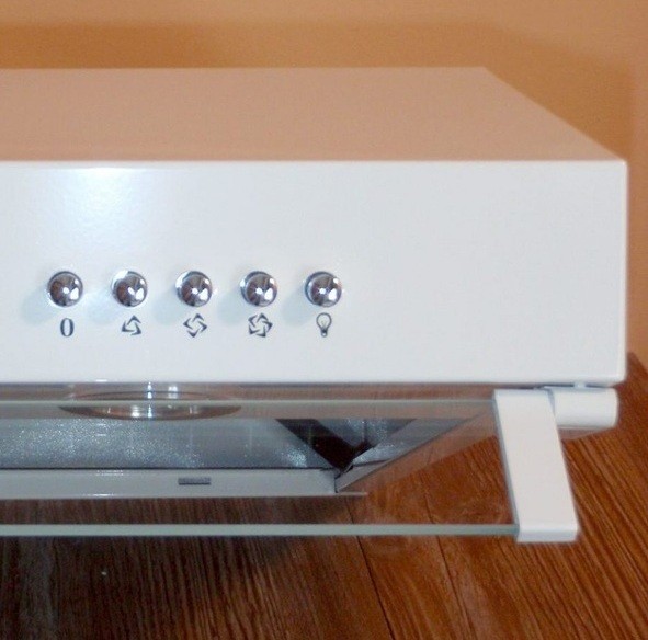 Колір витяжки – білий, матеріал – нержавіюча сталь, скляний козирок.