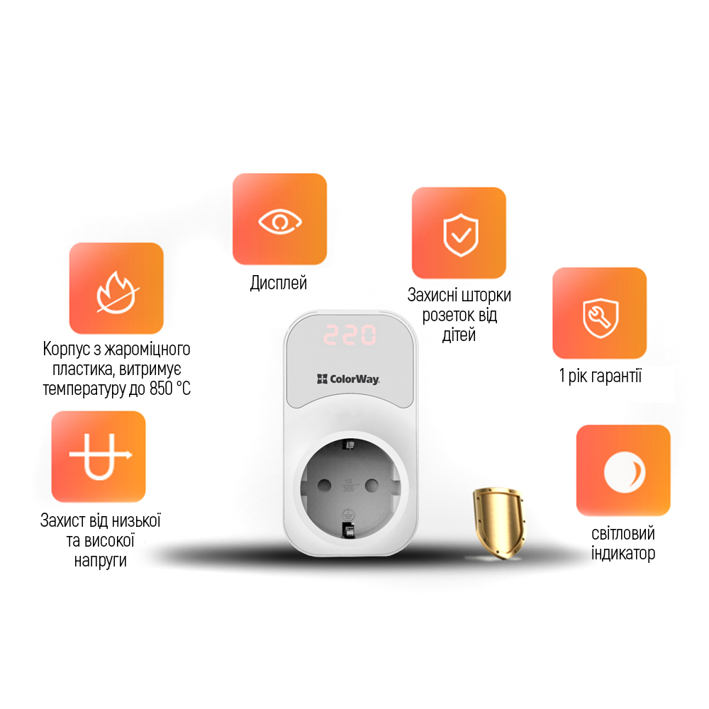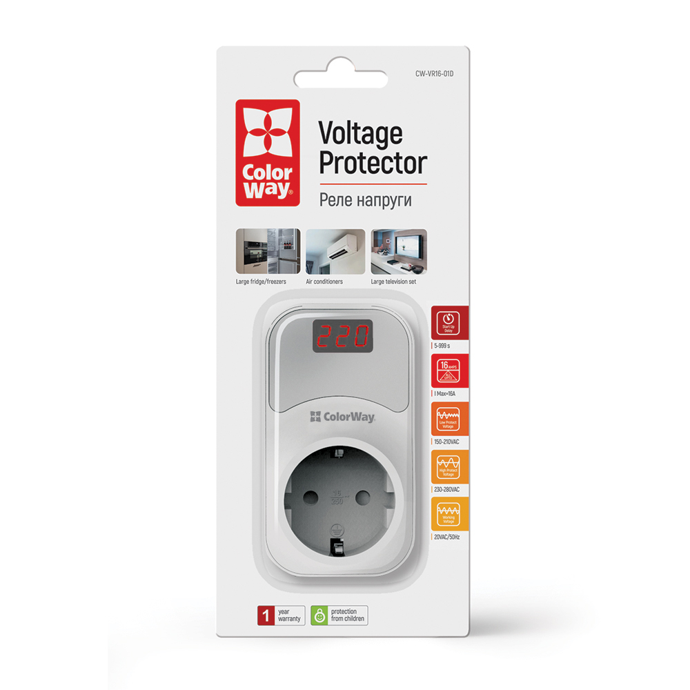 Реле напруги Сolorway – спеціальний пристрій захисту від перепадів напруги у мережі. Реле в режимі реального часу аналізує напругу мережі та автоматично вимикає підключену техніку від живлення при виході показників напруги на критичні позначки. Після повернення напруги у встановлений діапазон навантаження - автоматично вмикається з невеликою затримкою. Має дисплей з індикацією напруги та гнучкі налаштування нижнього та верхнього порогу відключення за напругою, а також налаштування часу затримки увімкнення обладнання від 5 до 999 секунд. Затримка під час увімкнення необхідна для обладнання, якому неприйнятні короткострокові відключення (холодильники, морозильні камери, кондиціонери).