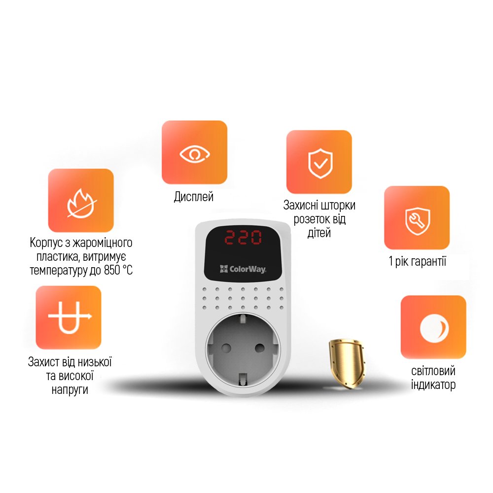 Реле напруги Сolorway – спеціальний пристрій захисту від перепадів напруги в мережі. Реле в режимі реального часу аналізує напругу мережі та автоматично вимикає підключену техніку від живлення при виході показників напруги на критичні позначки. Після повернення напруги у встановлений діапазон навантаження - автоматично вмикається з невеликою затримкою. Затримка під час увімкнення необхідна для обладнання, якому неприйнятні короткострокові відключення (холодильники, морозильні камери, кондиціонери).