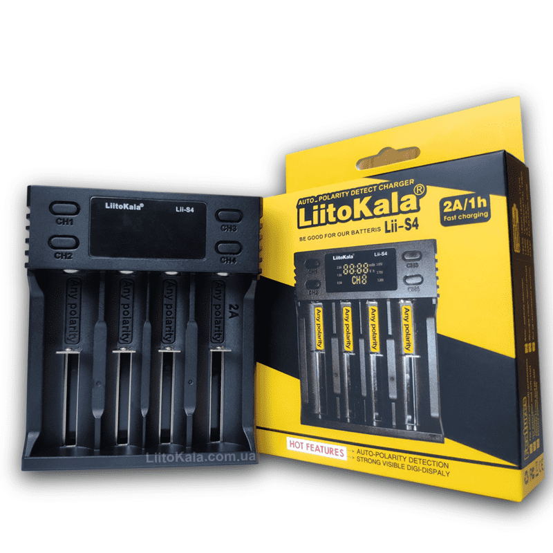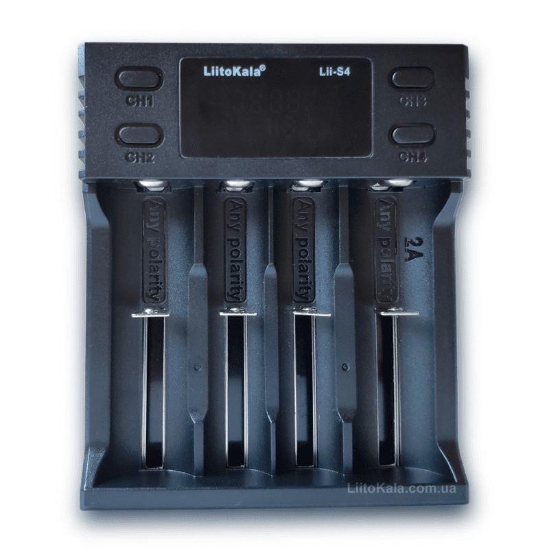 LiitoKala Lii-S4 — універсальний 4-х канальний зарядний пристрій з цифровим дисплеєм та автоматичним визначенням полярності встановленого акумулятора та визначення накопиченої ємності. Сумісний практично з усіма видами циліндричних акумуляторів різного хімічного складу — NiCd, NiMH, Li-Ion, LiFePO4 та практично всіх типорозмірів акумуляторів АА, ААА, С (R14), A, SС, 14500, 16340, 18350, 18650, 21700, 20700, 26650 та інші.