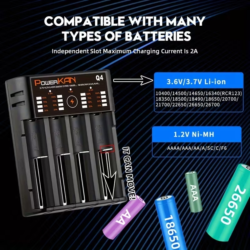 Зарядний пристрій PowerKAN Q4 для акумуляторів: 4 шт. 1.2V Ni-MH та 3.7V Li-ion (21700, 18650, 20700, 10440, 14500, 18500, 16340, 17500, 26650, 32650, AAA, AA, A, SC, C, F6), з кабелем Type-C USB