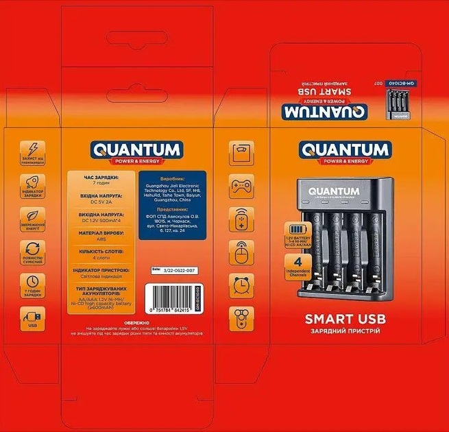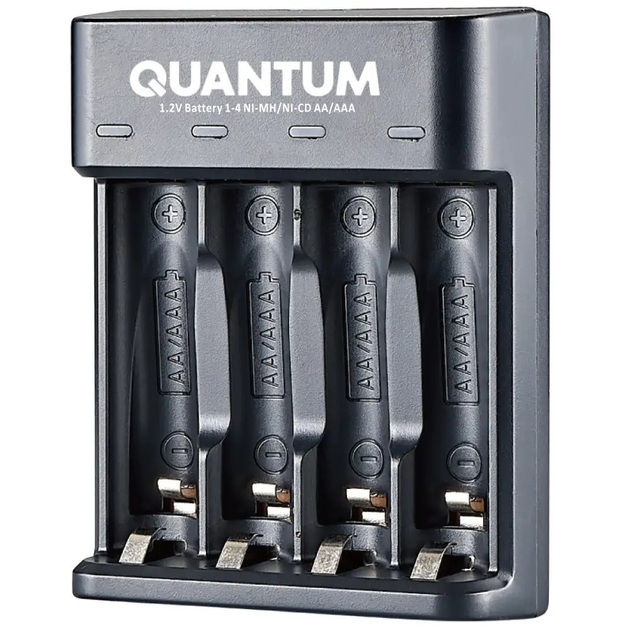Зарядний пристрій Quantum QM-BC1040 для акумуляторів AA/AAA NiMH/NiCd 1.2V Підходить для зарядки NiMH та Ni-Cd акумуляторів АА та ААА будь-якої ємності 4 незалежних канали зі світлодіодною індикацією Підключення через USB