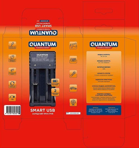 Зарядний пристрій Quantum QM-BC2020 використовує безпечну напругу постійного струму 5В для заряджання 3.7В акумуляторних батарей Li-ion. Пристрій може живитися від зарядки для мобільного телефону, павербанка, вихідного порту USB 5В комп'ютера або розгалужувача мережі. Зарядний пристрій має інтегральну схему, яка може ефективно контролювати, щоб акумулятор не перезаряджався.