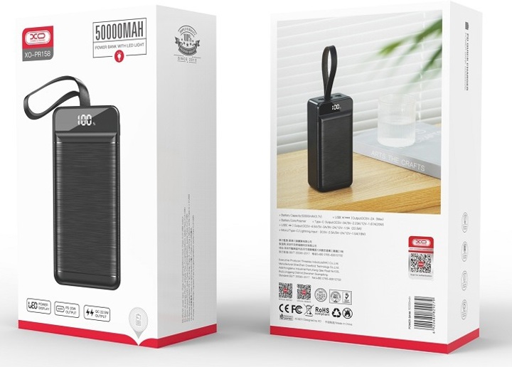 Цей портативний зарядний пристрій розпізнає тип пристрою, який заряджає і автоматично регулює силу струму, що продовжує адекватну роботу і девайсів, і самого повербанка. Наявність великої кількості портів дозволяє заряджати до 3 пристроїв одночасно. Таке доповнення, як ліхтарик, є корисною функцією для використання приладу в нічних умовах. Крім того, XO PR158 має практичну ручку для тримання, за яку його можна і підвісити в потрібному місці.